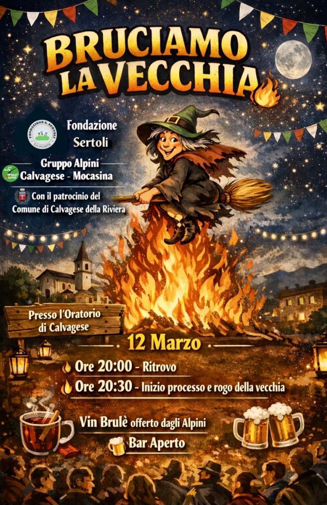 Bruciamo la vecchia con il patrocinio del Comune di Calvagese della Riviera, con Fondazione Sertoli, Gruppo Alpini Calvagese-Mocasina presso l'Oratorio di Calvagese della riviera