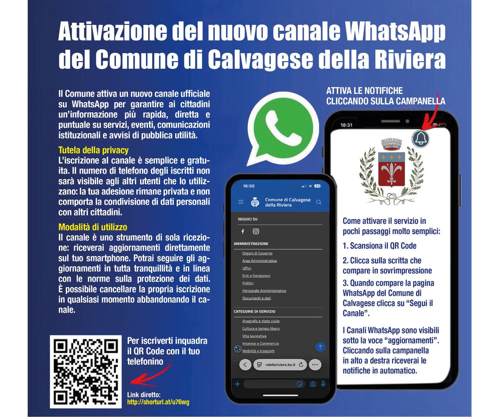Nasce il canale WhatsApp ufficiale del Comune di Calvagese della Riviera https://shorturl.at/u76wg
