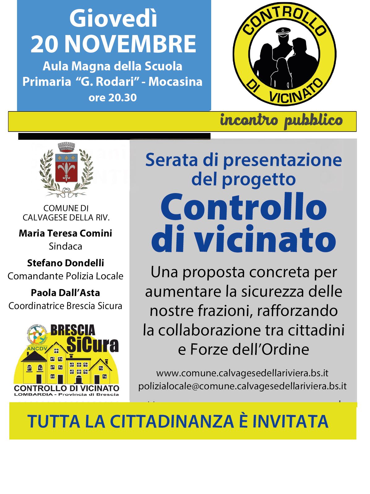 Giovedi 20 novembre alle ore 20.30 presso l'aula magna della scuola Primaria si svolgerà la serata di presentazione del progetto "controllo di vicinato"
